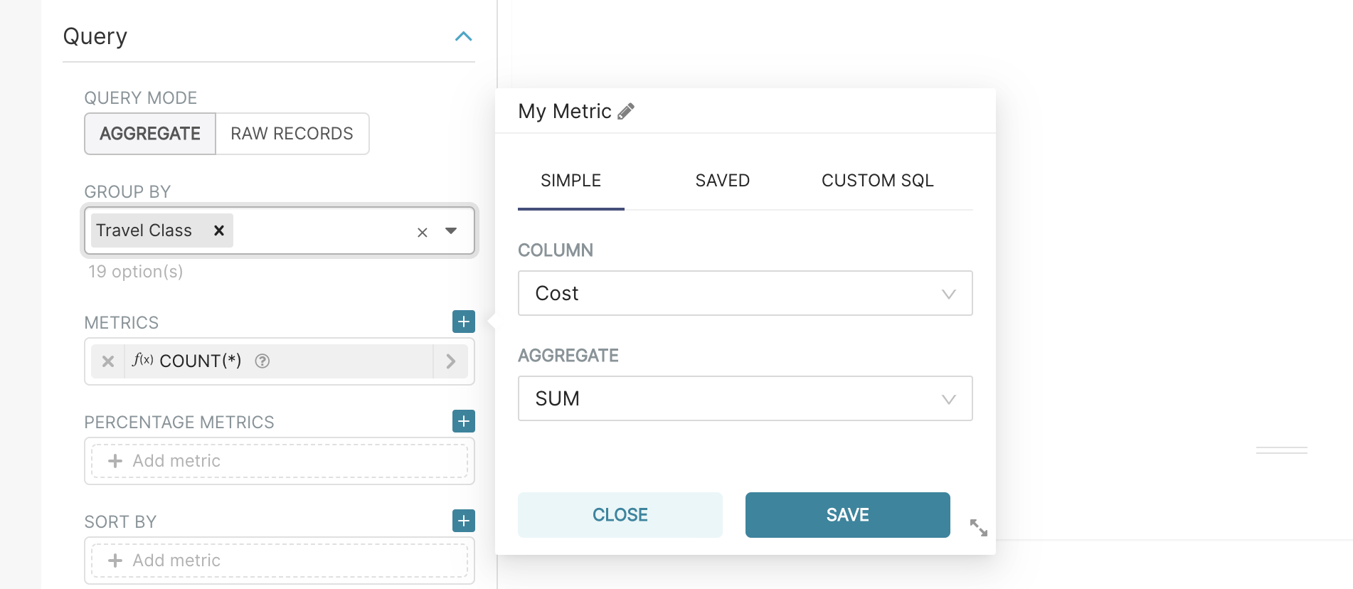 Next, within the Query section, remove the default COUNT(*) and add Cost, keeping the default SUM aggregate. Note that Apache Superset will indicate the type of the metric by the symbol on the left hand column of the list (ABC for string, # for number, a clock face for time, etc.).